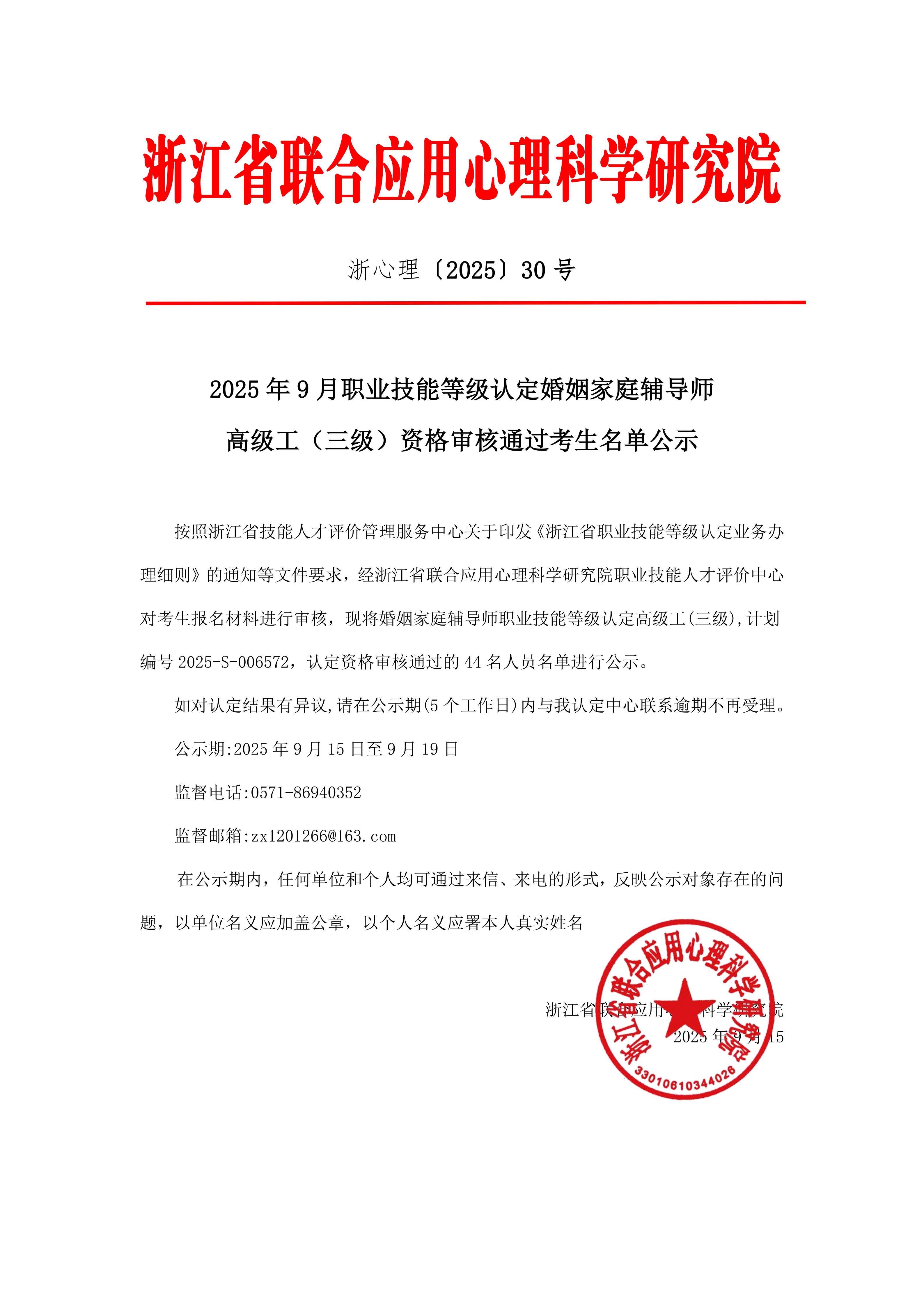 2025年9月职业技能等级认定婚姻家庭辅导师 高级工(三级)资格审核通过考生名单公示
