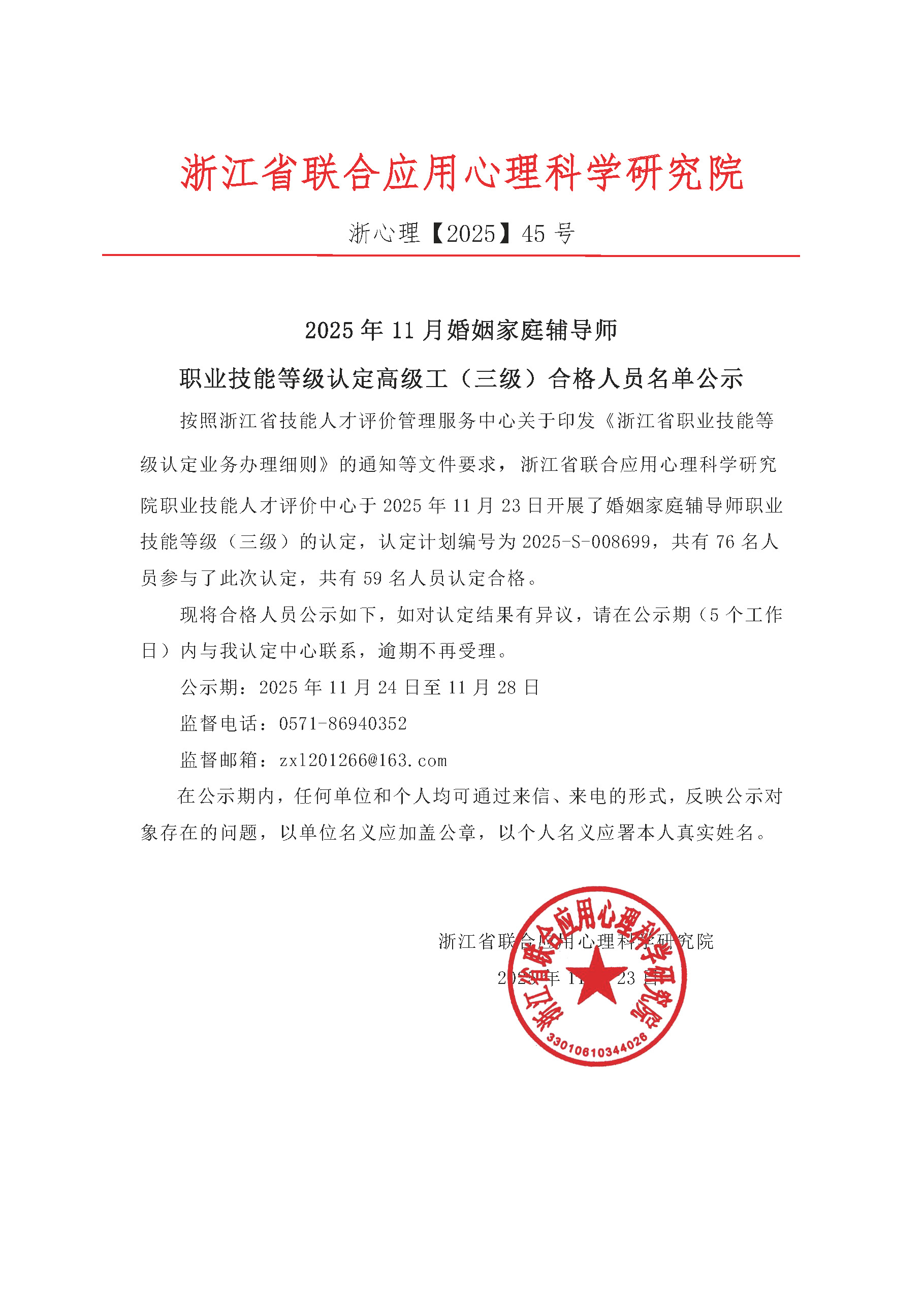 2025年11月职业技能等级认定婚姻家庭辅导师高级工(三级)资格审核通过考生名单公示