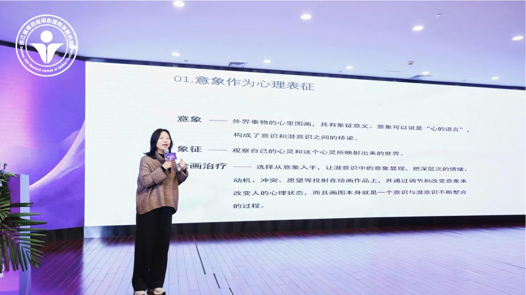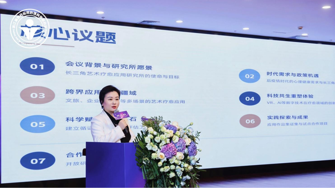 随后,浙江省联合应用心理科学研究院三角艺术疗愈应用研究所所长史和鹭作了题为《从疗愈到赋能:构建长三角艺术疗愈新生态圈》的大会主题报告。报告高屋建瓴,系统阐述了对艺术疗愈发展现状与未来趋势的深刻洞察。史和鹭所长明确指出,研究院将以推动长三角地区艺术疗愈从“感性的实践走向科学的验证,从边缘的探索走向主流的应用”为核心使命。她详细勾勒了未来努力构建的“政、产、学、研、用”五位一体协同创新生态体系,即通过政府政策引导、产业市场推动、学术研究支撑、研发技术转化和实际应用反馈的良性互动,打破学科与行业壁垒,整合长三角区域资源,最终打造一个充满活力、可持续发展的艺术疗愈新生态圈,使艺术疗愈不仅服务于个体心理修复,更能赋能组织发展、社区和谐与社会创新。