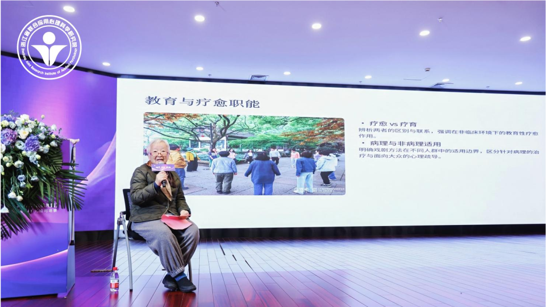 主题报告之后,四位在各自艺术疗愈领域深耕多年的知名学者带来了精彩纷呈的专题分享,充分体现了“跨界”与“共生”的大会理念。我国著名编剧、戏剧教育家李婴宁教授以《戏剧疗愈视角下的民众戏剧的心理疏导与赋能》为题,深入浅出地探讨了戏剧这一古老艺术形式所蕴含的疗愈基因。她从民众戏剧(论坛剧场、被压迫者剧场等)出发,阐述了如何通过戏剧游戏、情境扮演和集体共创,引导参与者释放情感、审视社会议题、激发内在力量,实现从个人到社群的赋能过程。