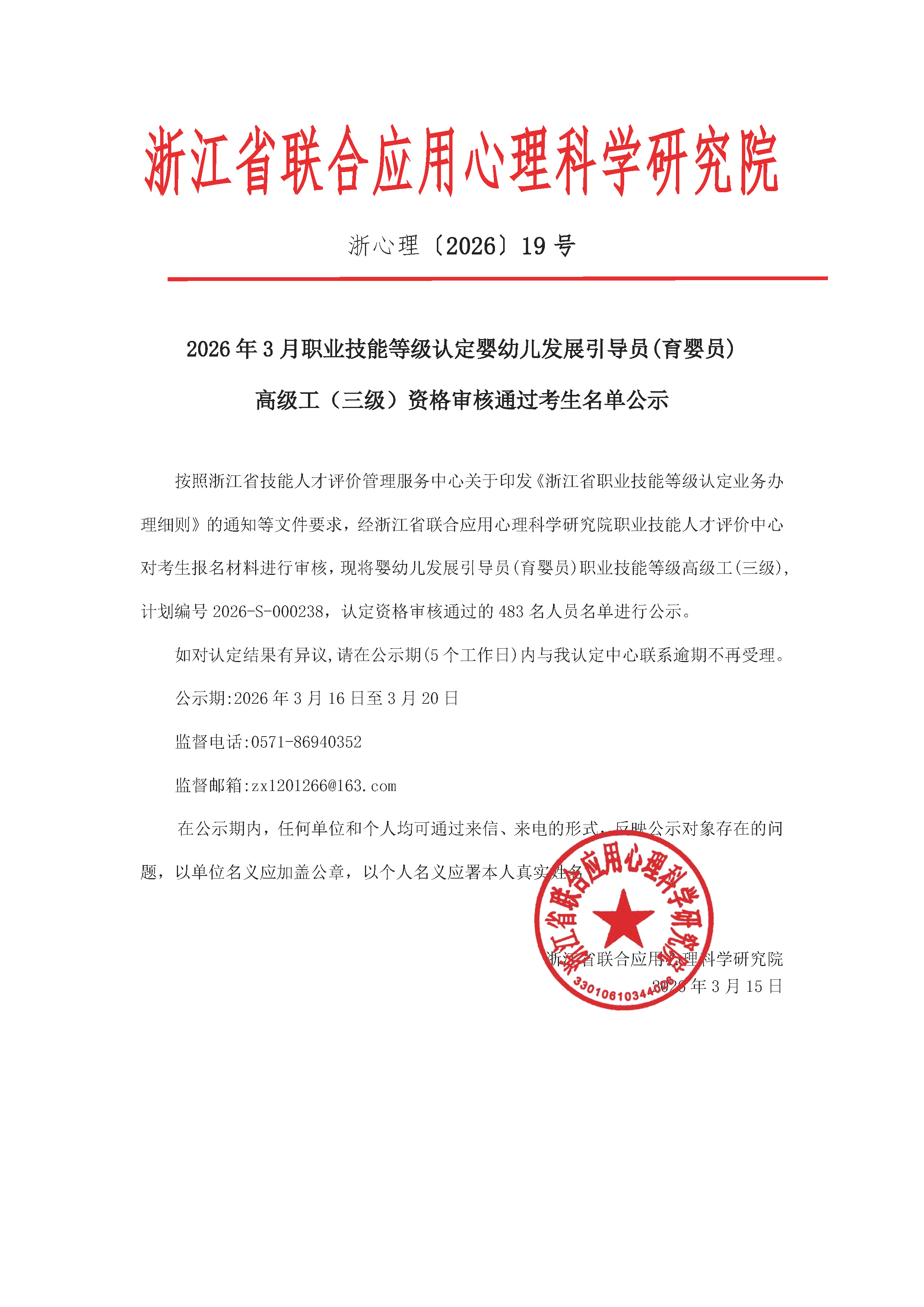 2026年3月职业技能等级认定婴幼儿发展引导员技师(二级)资格审核通过考生名单公示