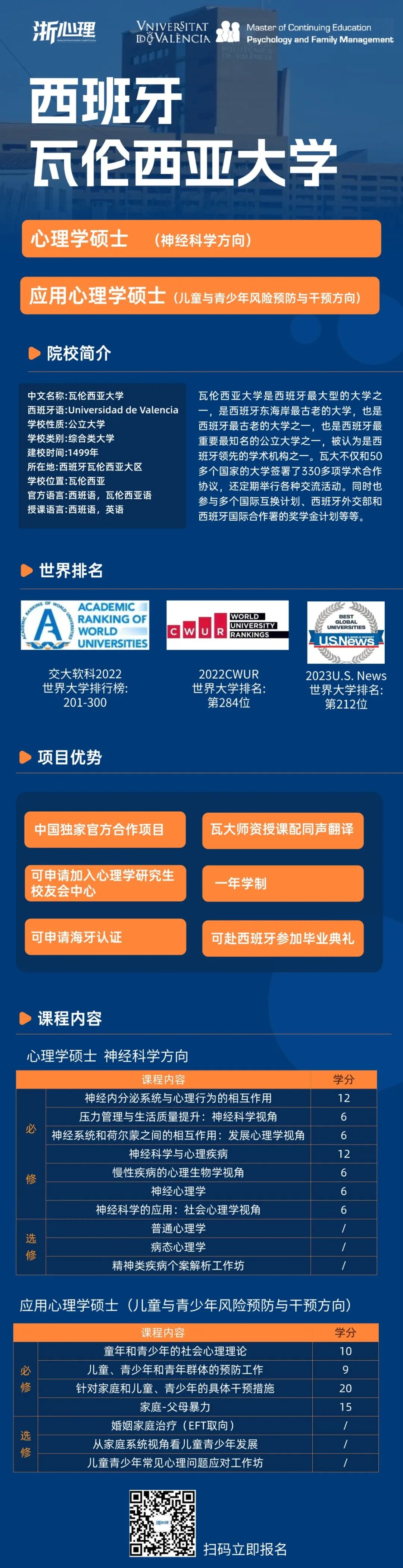 对心理学从业者而言,入学瓦伦西亚大学是突破专业瓶颈的绝佳契机:依托名校顶尖学术与国际资源,深耕心理学硕士(神经科学方向)或应用心理学硕士(儿童与青少年风险预防与干预方向),能夯实专业深度、拓宽国际视野,助力职业进阶与前沿领域深耕。
