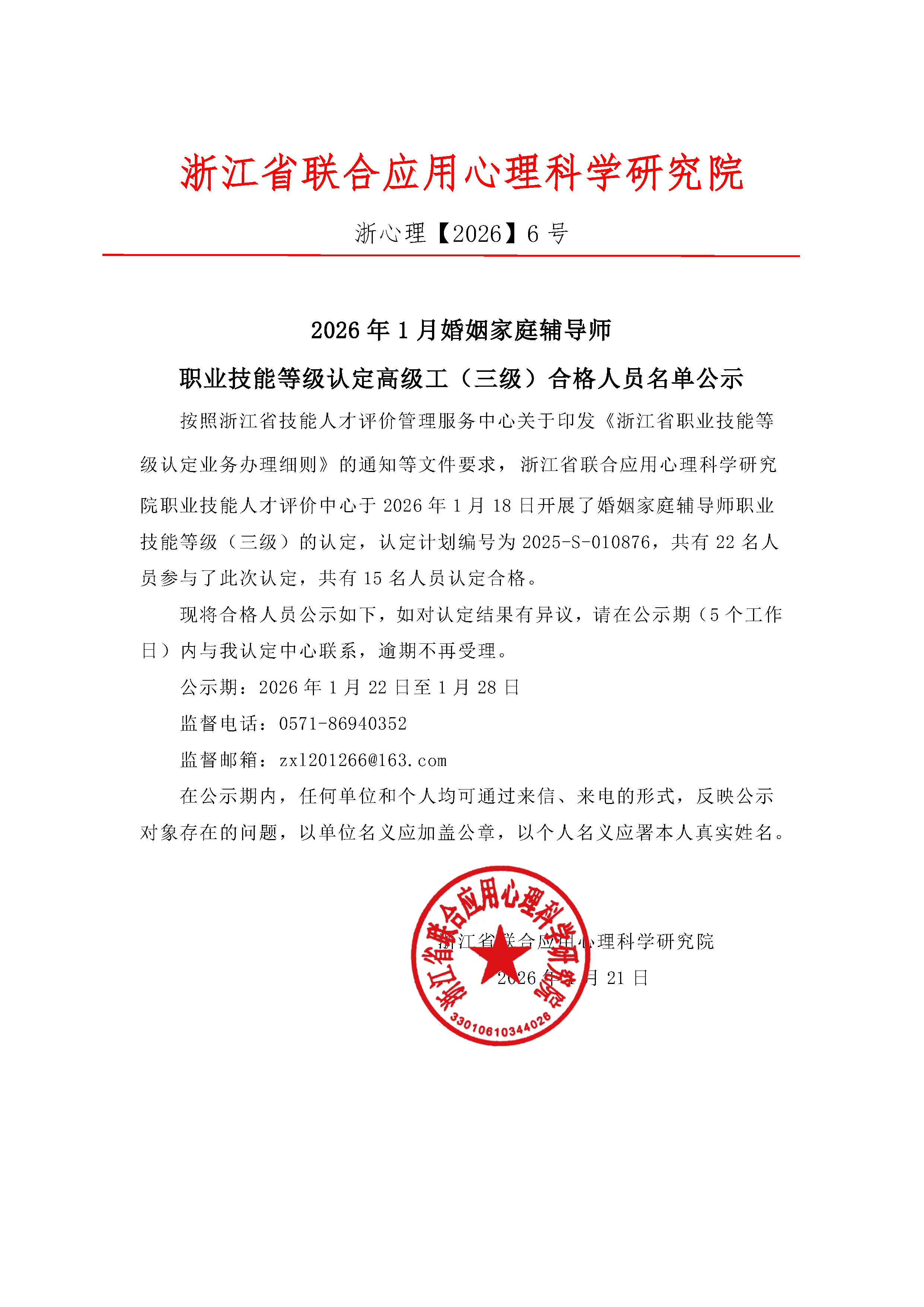 2026年1月职业技能等级认定婚姻家庭辅导师高级工(三级)资格审核通过考生名单公示